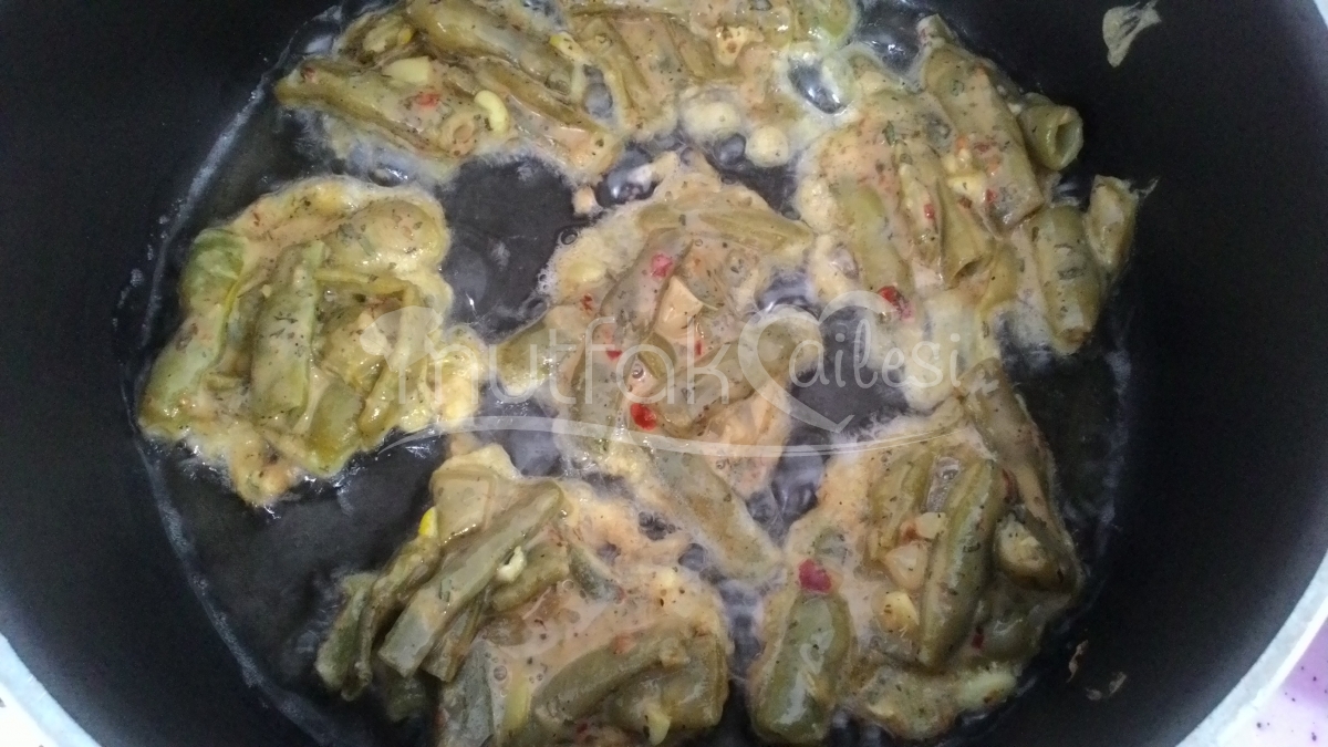 Fasulyeleri serçe parmağı kadar kesin daha sonra tencereye yağımızı koyduktan sonra fasülyeleri içine atıp kavuralım kavurulduktan sonra su ve tuzu ilave edip yumuşayıncaya kadar pişirelim